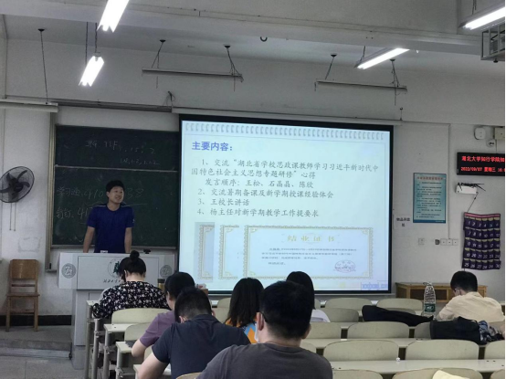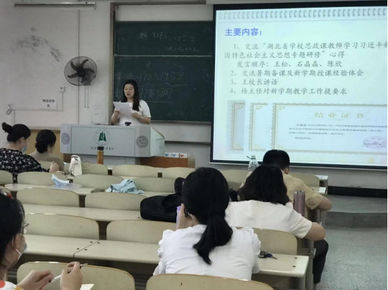 备课会上,王松、石晶晶、陈欣三位老师就参加暑期省教育厅举办的“湖北省学校思政课教师学习习近平新时代中国特色社会主义思想专题研修班”学习向大家进行了汇报,并就研修学习分享了自己的心得体会。他们认为此次研修收获满满,既学到了如何设计和讲授一堂高效的思政课,也学到了真正的专业成长是教学和科研相互助力的成长,为后续的教学提供了巨大的帮助,用在研修班中所学到的先进理念和方法,把思政小课堂和社会大课堂结合起来,与时俱进,贴近生活,不断增强思政课的思想性,理论性,亲和力和针对性,进一步提升思政课教学实效。