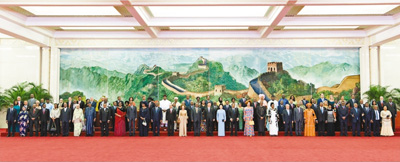 当晚的人民大会堂灯火通明,欢乐祥和。习近平和彭丽媛同贵宾们亲切握手,互致问候。56位活泼可爱的少年儿童手持中非合作论坛成员方国旗、会旗,热烈欢迎中外领导人夫妇,手拉手一一引领领导人夫妇集体合影。习近平和彭丽媛同各国领导人及夫人在巨幅苏绣壁画《长城》前合影留念。随后,壁画打开,中外领导人夫妇在汉白玉台阶前驻足,欣赏童声合唱《茉莉花》。在前往宴会厅沿途,盛装的青少年载歌载舞,欢迎远道而来的贵宾。