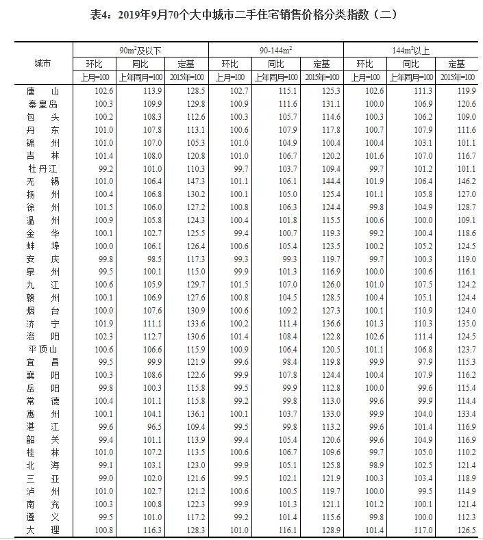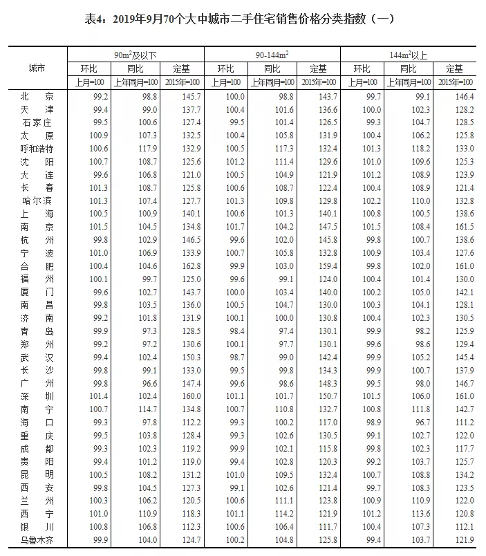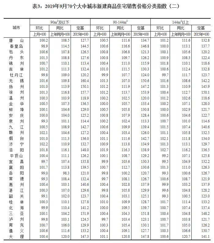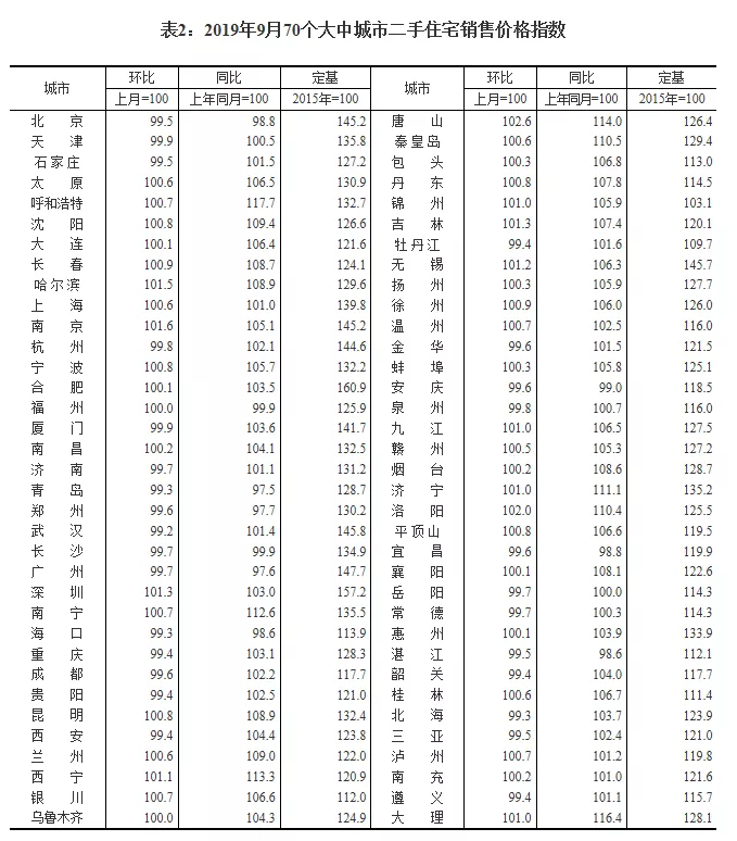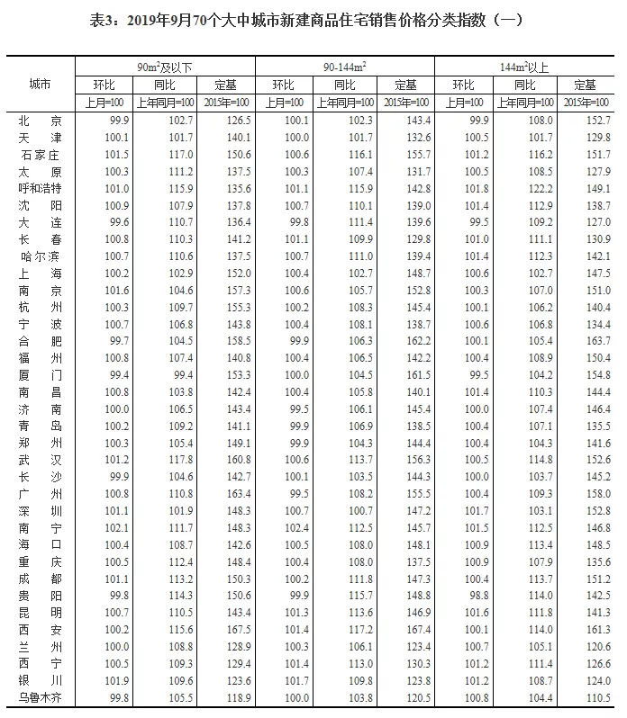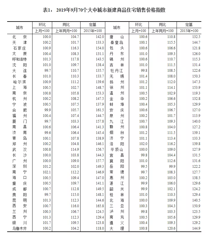 2019年9月份70个大中城市商品住宅销售价格变动情况