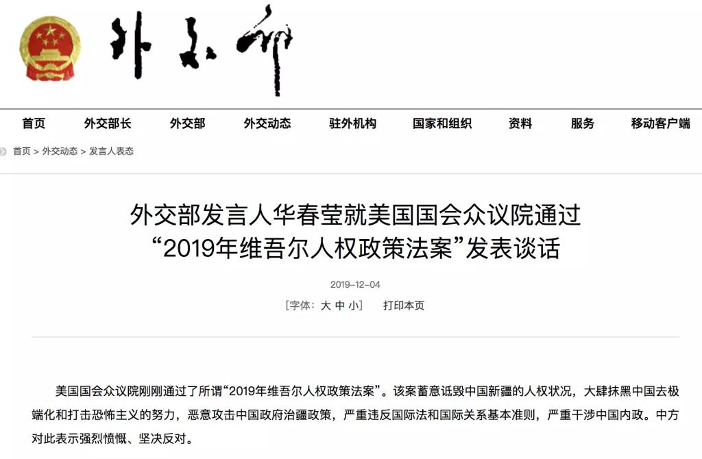 美国国会众议院刚刚通过了所谓“2019年维吾尔人权政策法案”。该案蓄意诋毁中国新疆的人权状况,大肆抹黑中国去极端化和打击恐怖主义的努力,恶意攻击中国政府治疆政策,严重违反国际法和国际关系基本准则,严重干涉中国内政。中方对此表示强烈愤慨、坚决反对。