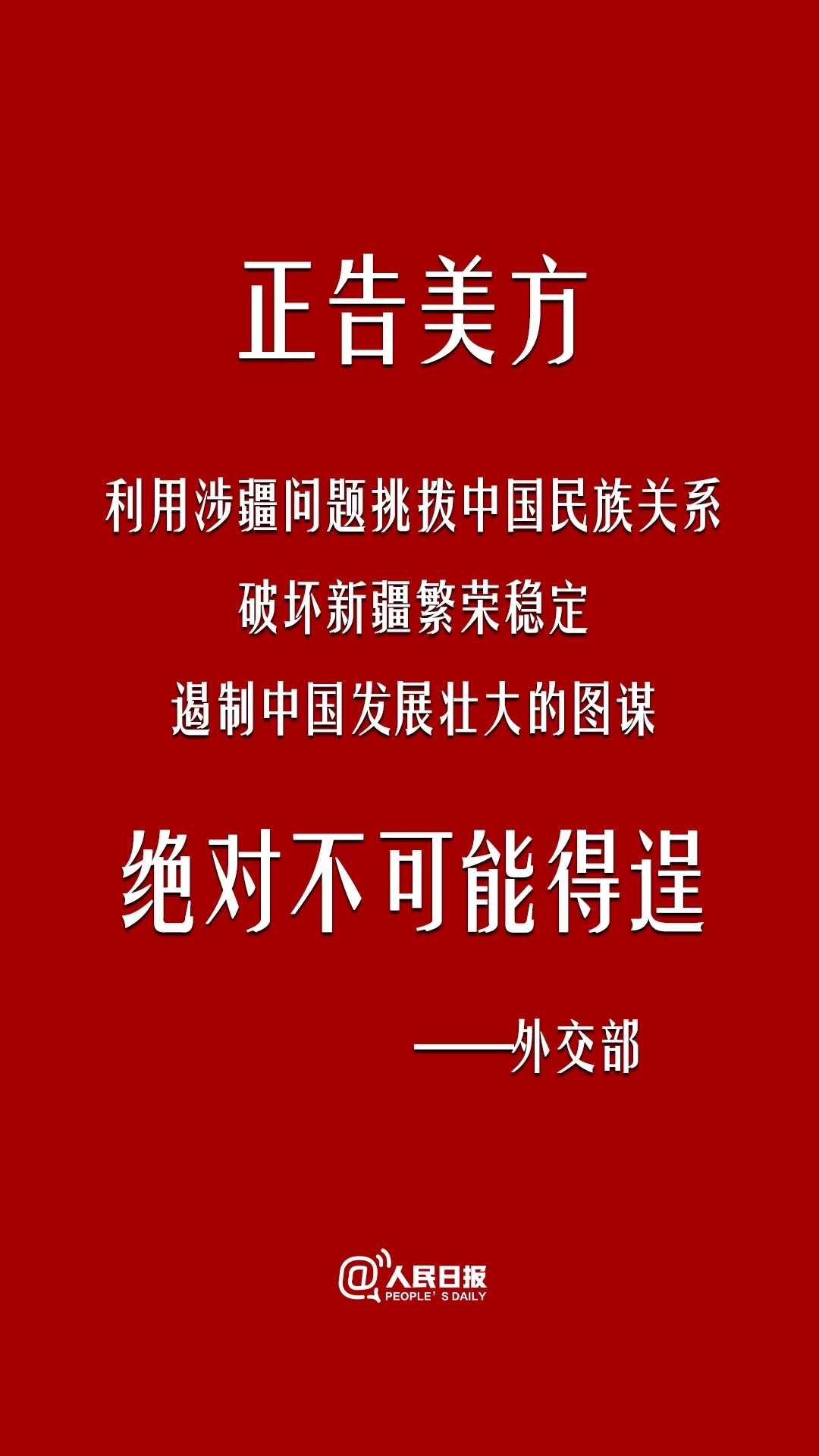 中国政府和人民捍卫国家主权、安全、发展利益的决心坚定不移。美方利用涉疆问题挑拨中国民族关系、破坏新疆繁荣稳定、遏制中国发展壮大的图谋是绝对不可能得逞的。我们奉劝美方立即纠正错误,阻止上述涉疆法案成法,停止利用涉疆问题干涉中国内政。中方将根据形势发展作出进一步反应。